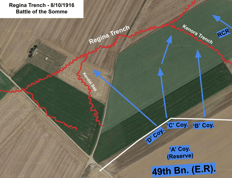 After crossing shell-swept ground, the 49th reached their positions at Sugar Trench. The plan was for all four companies to leapfrog through the 42nd Battalion and Princess Patricia's Canadian Light Infantry to capture Fabeck Graben and the Chalk Mound. However, a failure to secure the first objective in it's entireity forced a change.